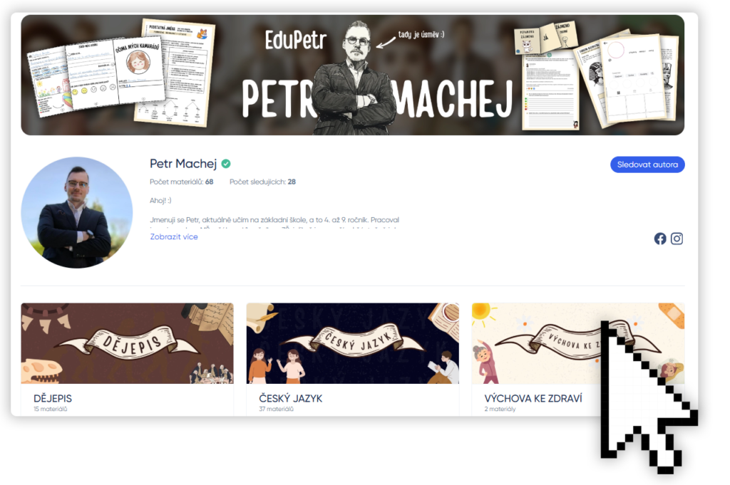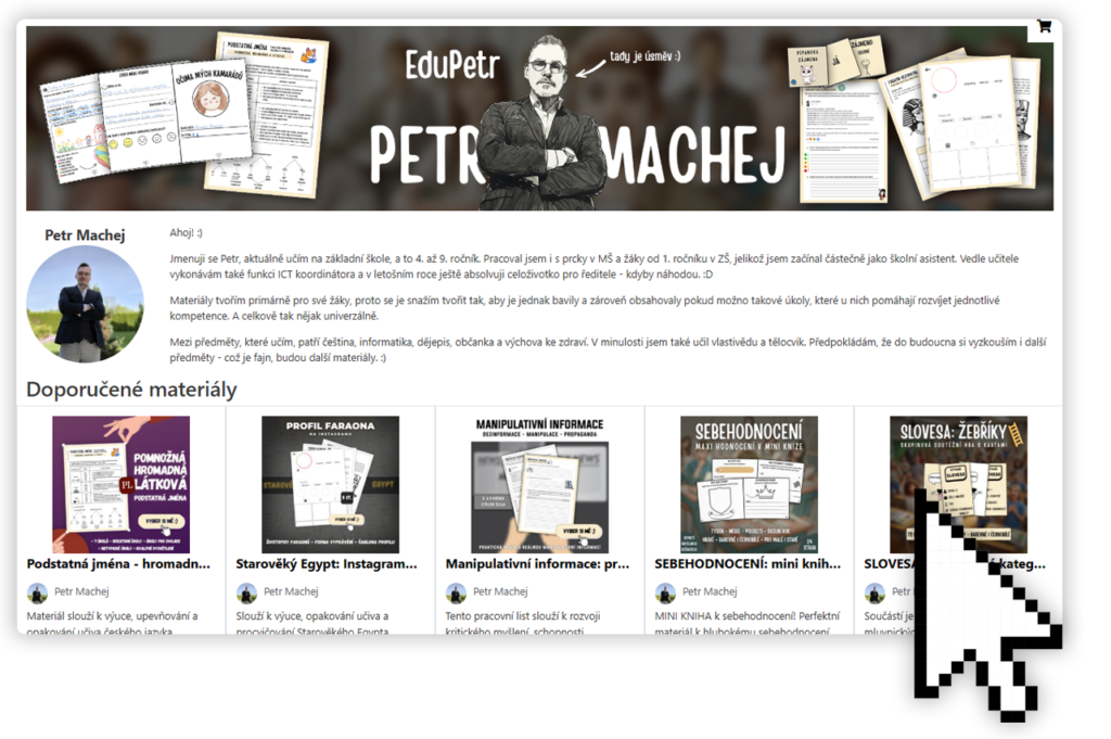 Na Učitelnici jsou všechny mé aktuálně zpracované materiály. Konkrétně tedy ty, které jsem přepracoval do podoby, se kterou jsem spokojený natolik, abych je dal k prodeji. Řeč je tedy o zpracování i vizuálu, stručné „metodiky“ a podobně.